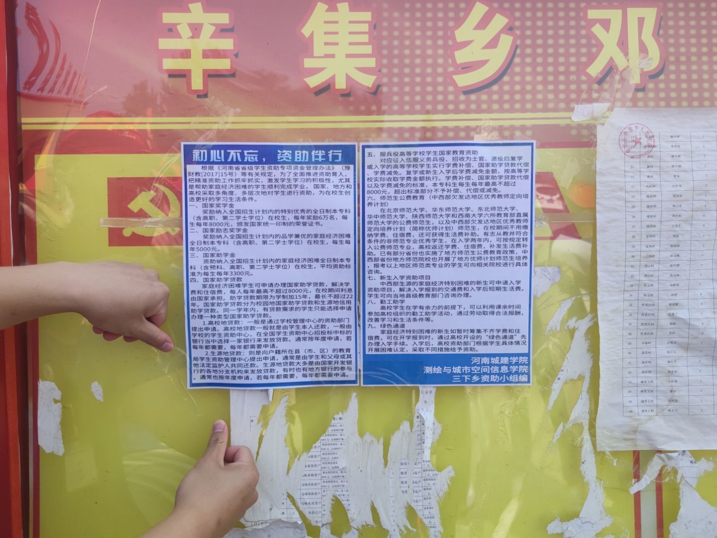 图为团队成员在村内宣传栏张贴资助政策文件。中国青年网通讯员 陈金辉 供图