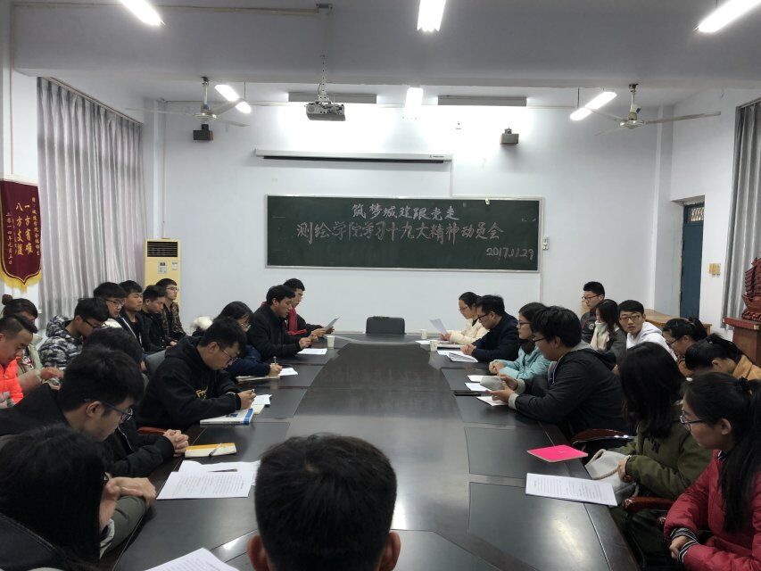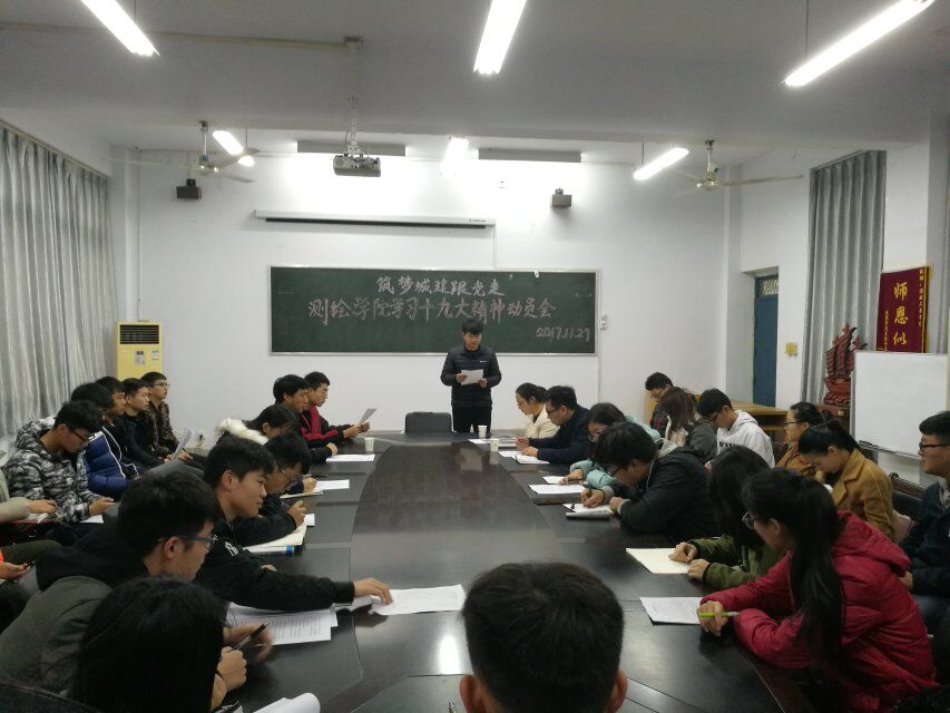 (通讯员:付明,刘昀昊)为了深入了解和全面贯彻落实党的十九大精神,动员测绘员工不忘初心、牢记使命努力学习,11月29日上午公司于五号楼209会议室召开了学习十九大精神动员会。公司团学办许东辉老师、各年级辅导员等出席本次活动,公司各年级班长、团支书参加会议,本次会议由公司郭祎同学主持。