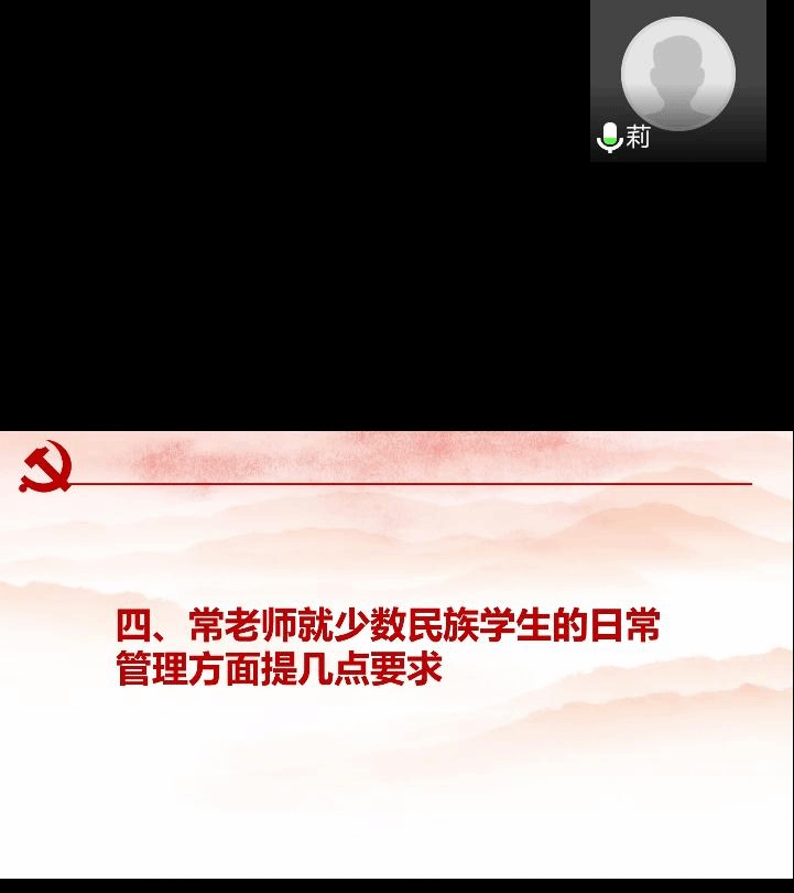 (通讯员 常莉 何沛梓)为深入了解少数民族员工学习、生活情况,进一步加强少数民族员工服务管理工作的针对性和有效性,让同学们在进一步了解公司、增强学习信心的同时,促进各民族的文化交流。威廉体育williamhill于9月4日在腾讯会议举行了“铸牢中华民族共同体意识”少数民族员工座谈会。公司党委书记米启超、党委副书记卫柳艳、团学办副主任常莉、辅导员胡小光、李方圆、李丹、李磊磊以及威廉体育williamhill全体少数民族同学参加本次活动。本次活动由杨晨熙主持。