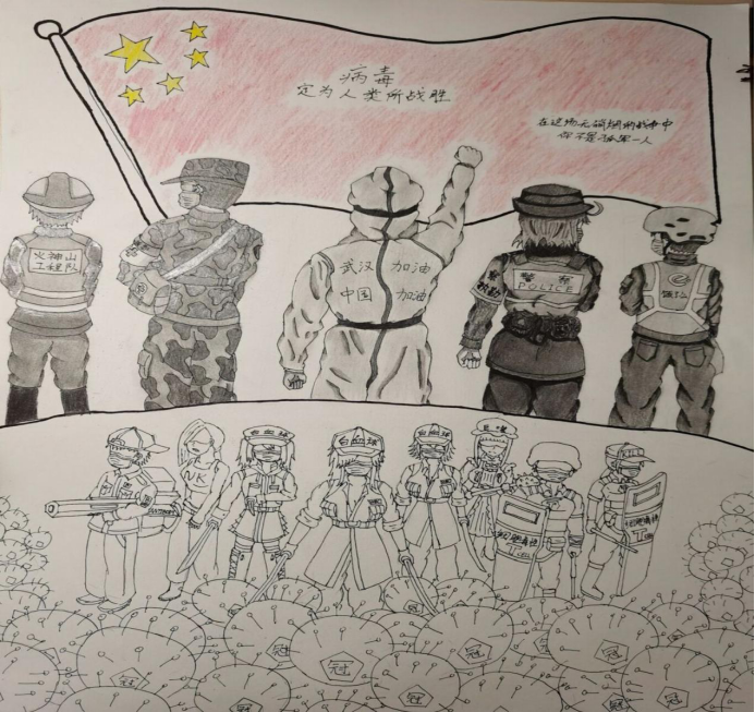 活动伊始,同学们踊跃报名参与,在课余时间发挥才艺和脑洞创作佳品。期间,同学们团结合作,互相帮助和修缮。特色各异、主题鲜明的漫画、水彩画、水墨画如约呈现。从参赛作品中可以看出同学们面对疫情时的积极健康心态以及对防疫知识和疫情心理健康知识的了解。从活动氛围中可以看出同学们精力充沛的精神面貌和协作共赢的精神理念。