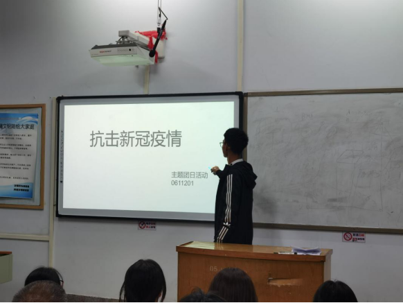 各班的团支书通过板书和多媒体介绍了主题团日活动的主要内容,并让同学们相互交流了疫情期间自己所知道的感人事迹和心得体会,并写下了感言。最后在团支书的总结中结束了班会。