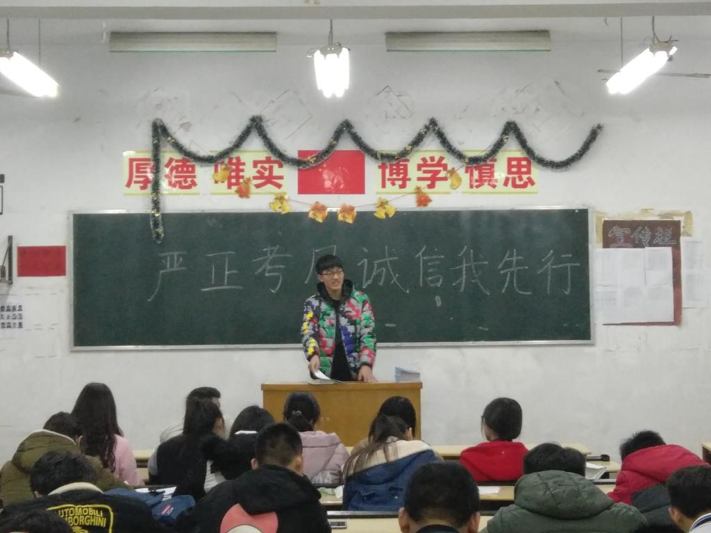 在班会上,宣传委员对同学们讲述了违纪考试的危害与严重性,要求同学们做一个诚实的人,不应为几分或者几十分而丢失自己的人格,同时告诫同学们不要因为一时侥幸未被发现而一错再错,作为一名员工诚实守信是老员工的必备素质,要学会诚信考试,做到即使在没有监考老师的情况下也能自觉遵守考场秩序,展现出一名老员工应有的基本素质。