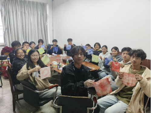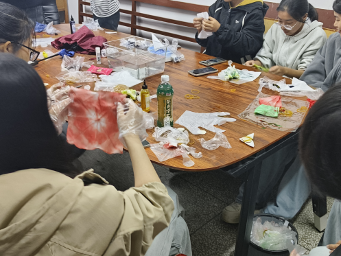 创作环节中,同学们热情投入,结合所学技巧与个人创意处理手帕、进行染色。随着作品陆续完成,活动进入展示交流环节,大家分享各自的扎染成果与创作思路,现场氛围轻松热烈,充满欢声笑语。