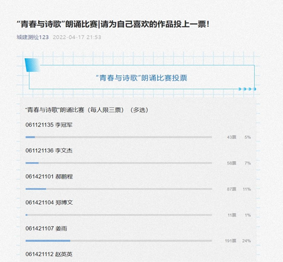 选手们仪态大方,精神饱满,声音洪亮,同时结合自己的感悟,通过一段段精彩的朗诵,表达了自己的理想与向往。他们以激扬的热情与澎湃的声音为听众带来了一场听觉盛宴,展现了活力四射的青春与满腔热忱。本次比赛经历了网上投票,线下评审环节,最终根据网上投票情况以及评委的综合意见评定参赛选手成绩。