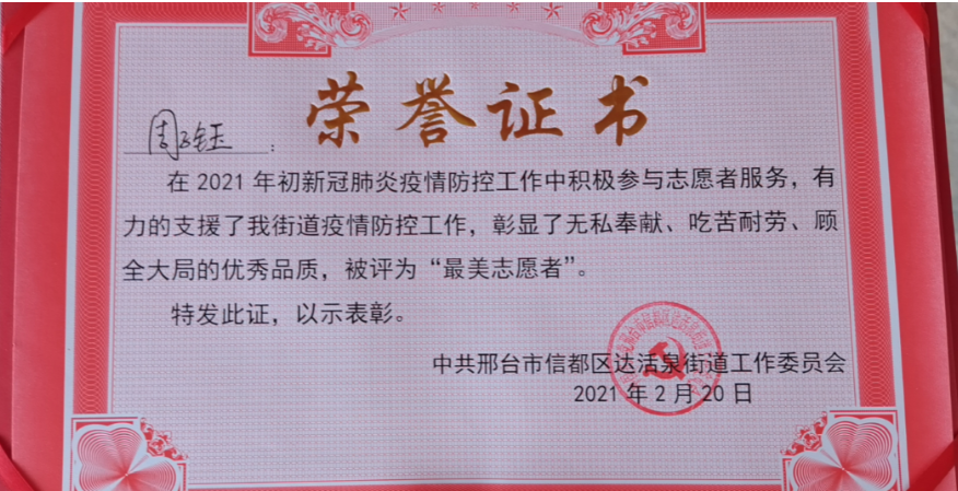 事情转回到2021年1月份,公司刚刚放假,此时全国多地突然出现多起聚集性新冠肺炎病例,其中河北邢台为较严重的地区之一,当时该市在一定范围内开始施行封闭管理,面对来势汹汹的疫情,很多热心青年并没有被吓倒,纷纷投入到这场抗疫斗争中,来自威廉体育williamhill的周子钰就是其中的一位。她此时才刚刚放学回家,没顾上休息第一时间来到了社区街道办事处要求以志愿者身份参加抗疫工作。