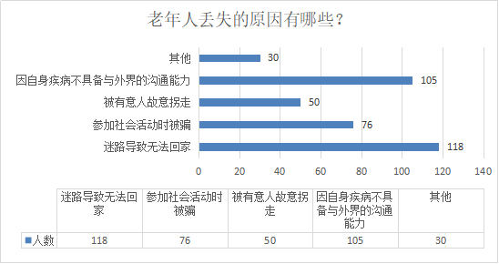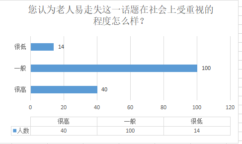 从调查的实际情况来看,社会各界人士认为;老人走失这一社会热点的关注度普遍一般,有待进一步的提高。从大量老人走失的案例中,我们可以发现老人走失的主要原因是其患有老年痴呆症或精神疾病,也有的是因为年龄太大,记忆力减退,辨识能力差等。