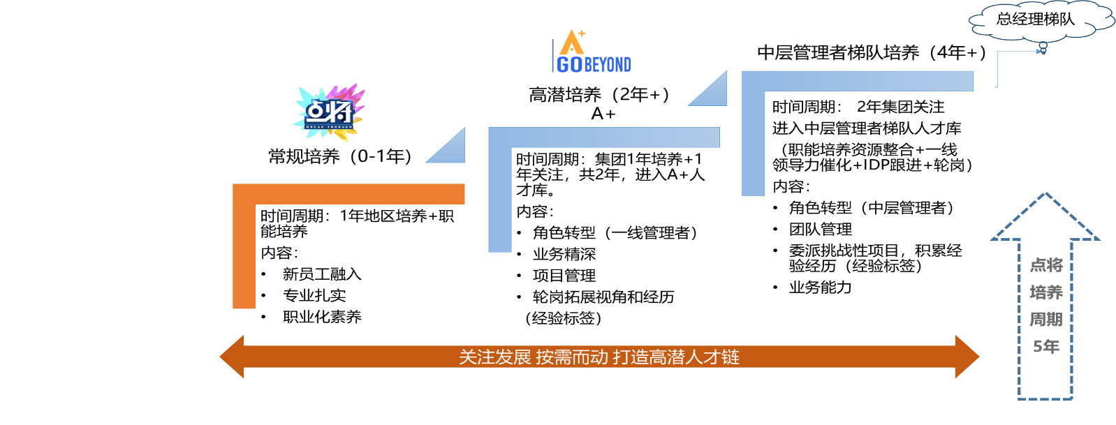 我们期望通过点将项目招聘到的优秀毕业生,用1.5年完成从员工到职业人士的转变,通过3-5年的时间,逐步成长为公司的中高层管理者。点将项目,助你成为同龄人中的佼佼者。