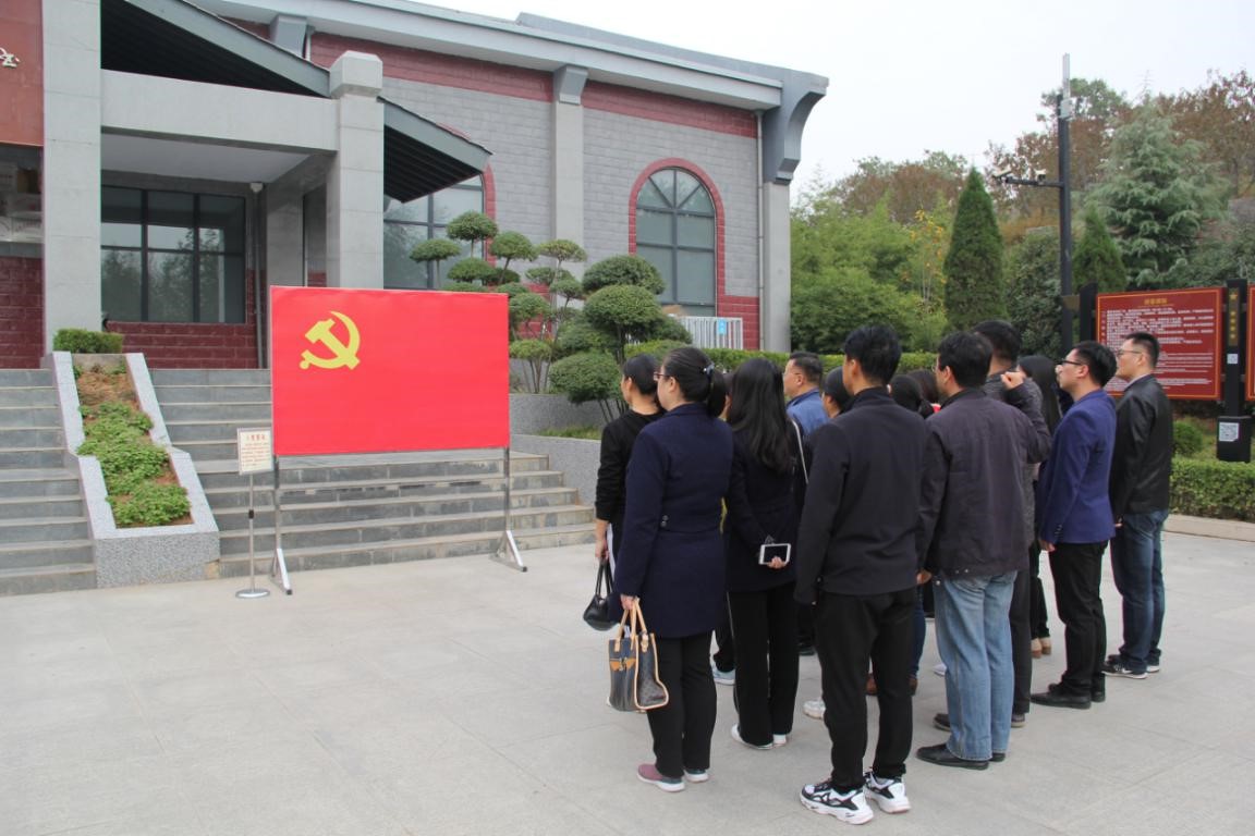 在八路军豫西抗日纪念馆广场前,党总支书记米启超带领全体人员,面对鲜红的党旗,重温入党誓词。