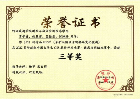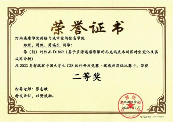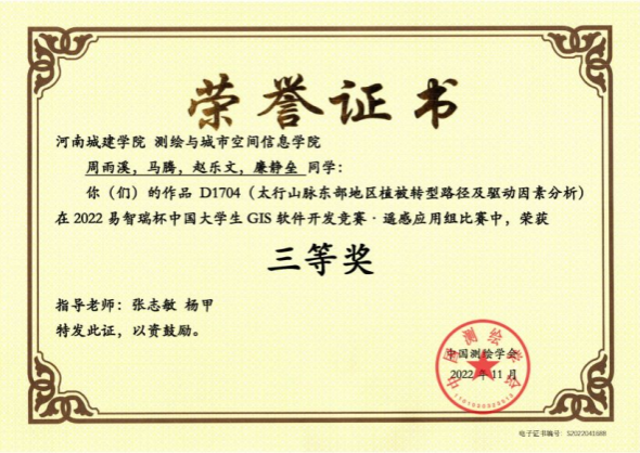 (通讯员:张志敏 郑煜)11月8日,由中国测绘学会主办、易智瑞信息技术有限公司承办的2022易智瑞杯中国老员工GIS软件开发竞赛(简称“GIS开发竞赛”)落下帷幕。本次竞赛(遥感应用组)吸引了来自全国98所高校的300余项作品参赛,经过激烈角逐,共评选出一等奖13组、二等奖32组、三等奖95组和优胜奖若干组。公司威廉体育williamhill学子在张志敏、杨甲、宋自影等老师的精心指导下,在本次竞赛中共获得二等奖1项、三等奖2项。