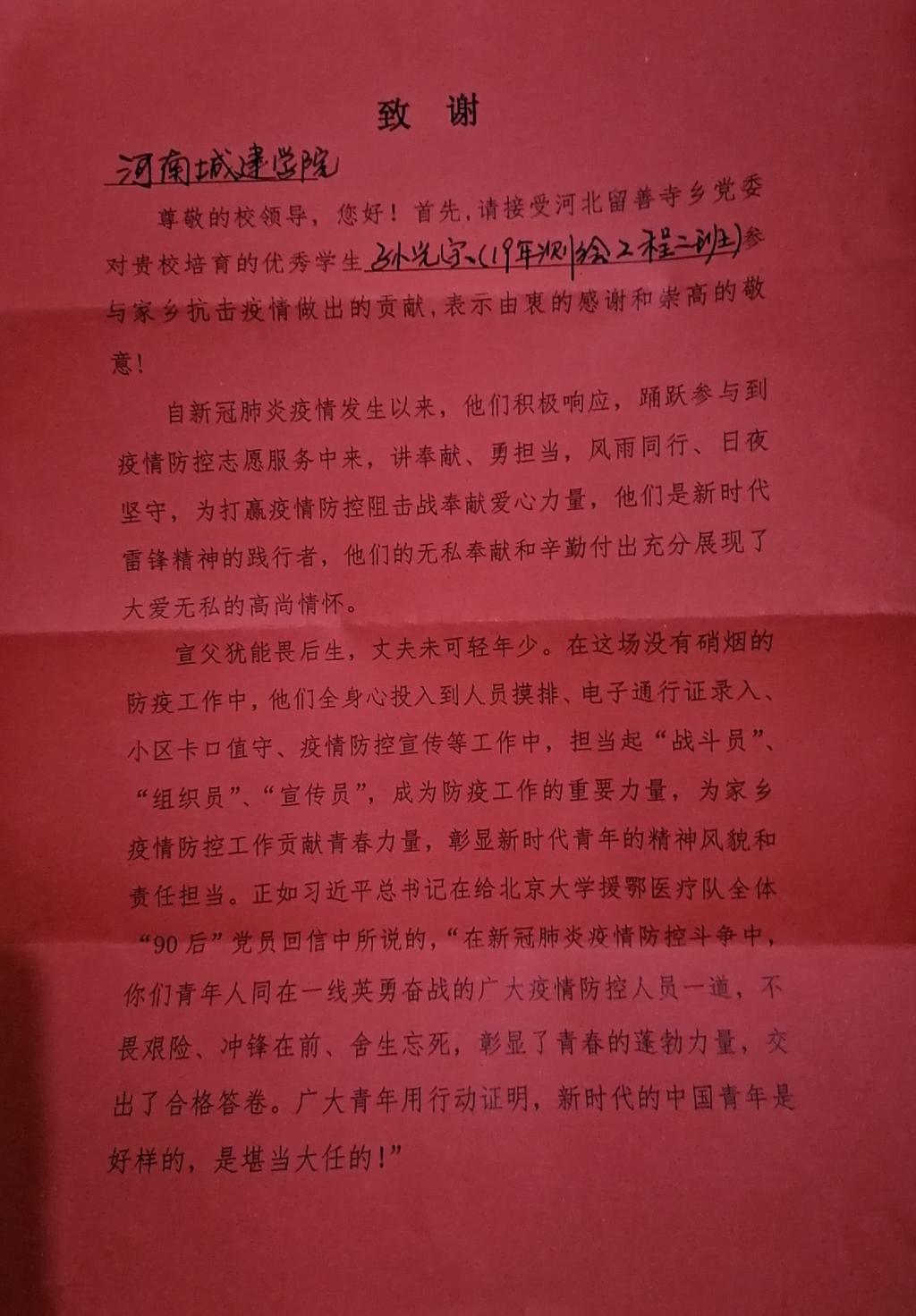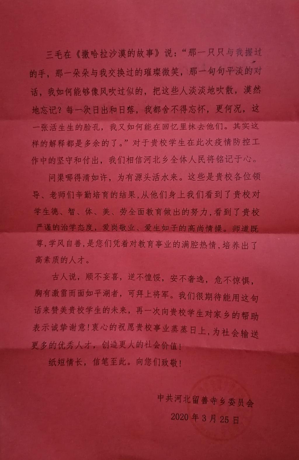 (通讯员 李方圆 陈奥)近日,公司收到一封来自中共河北留善寺乡委员会的感谢信,对威廉体育williamhill孙光宗同学参与当地抗击疫情做出的贡献,表示由衷的感谢和崇高的敬意。