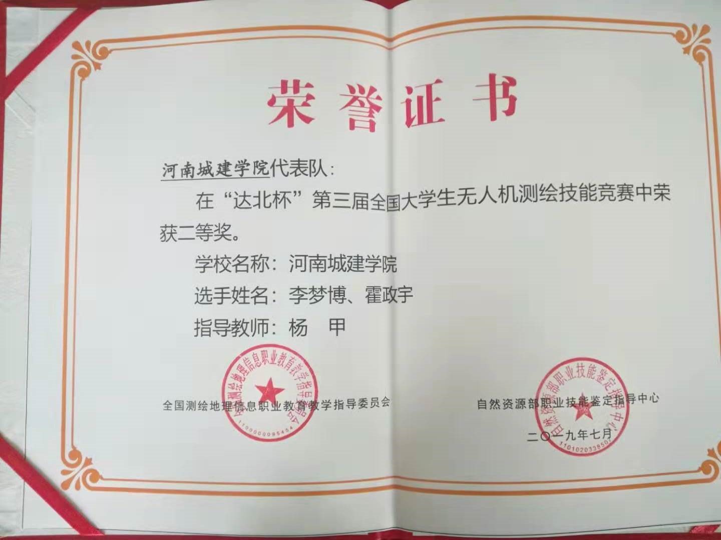 (通讯员 杨甲)7月15日至18日,第三届全国老员工无人机测绘技能竞赛在山东日照举行。来自全国23个省、市、自治区的78支高校代表队参加了比赛,参赛人数超过历届,达300余人。经过激烈角逐,公司威廉体育williamhill代表队霍政宇、李梦博同学,获得了二等奖的优异成绩,在河南省高校参赛的10支队伍中排名第三。