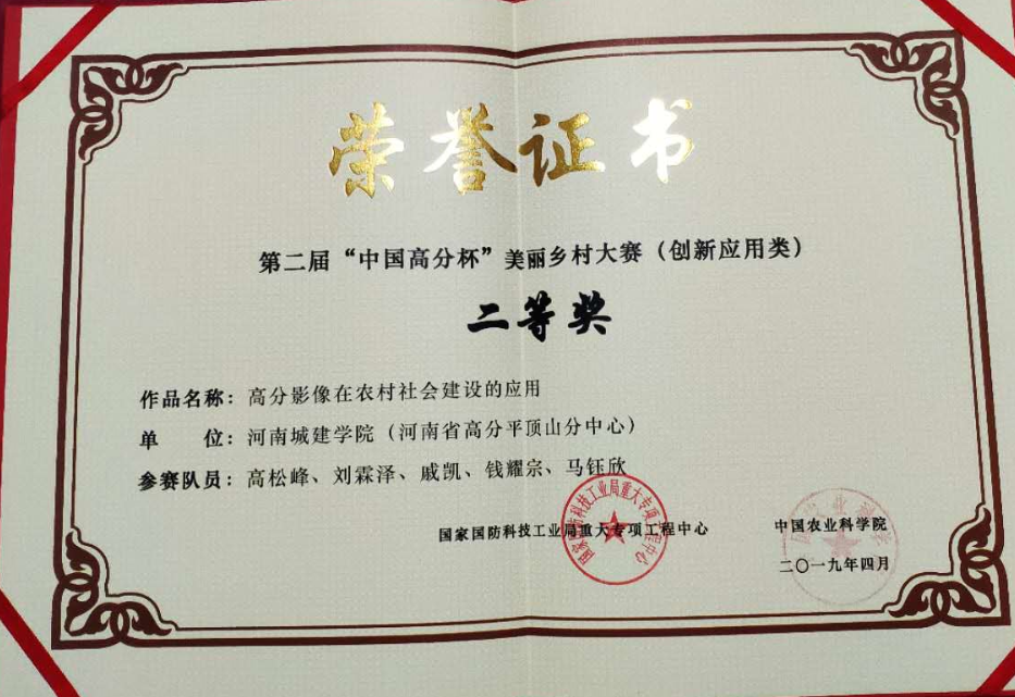 (通讯员 刘霖泽)2019年4月23日,由国家国防科技工业局重大专项工程中心、中国农业科公司、中国航天基金会联合主办的第二届“中国高分杯”全国高分技术应用与美丽乡村建设大赛在湖南大学举行隆重颁奖典礼,由公司威廉体育williamhill教师高松峰指导,员工刘霖泽、戚凯、钱耀宗、马钰欣参赛的作品“高分影像在农村社会建设的应用”荣获二等奖。
