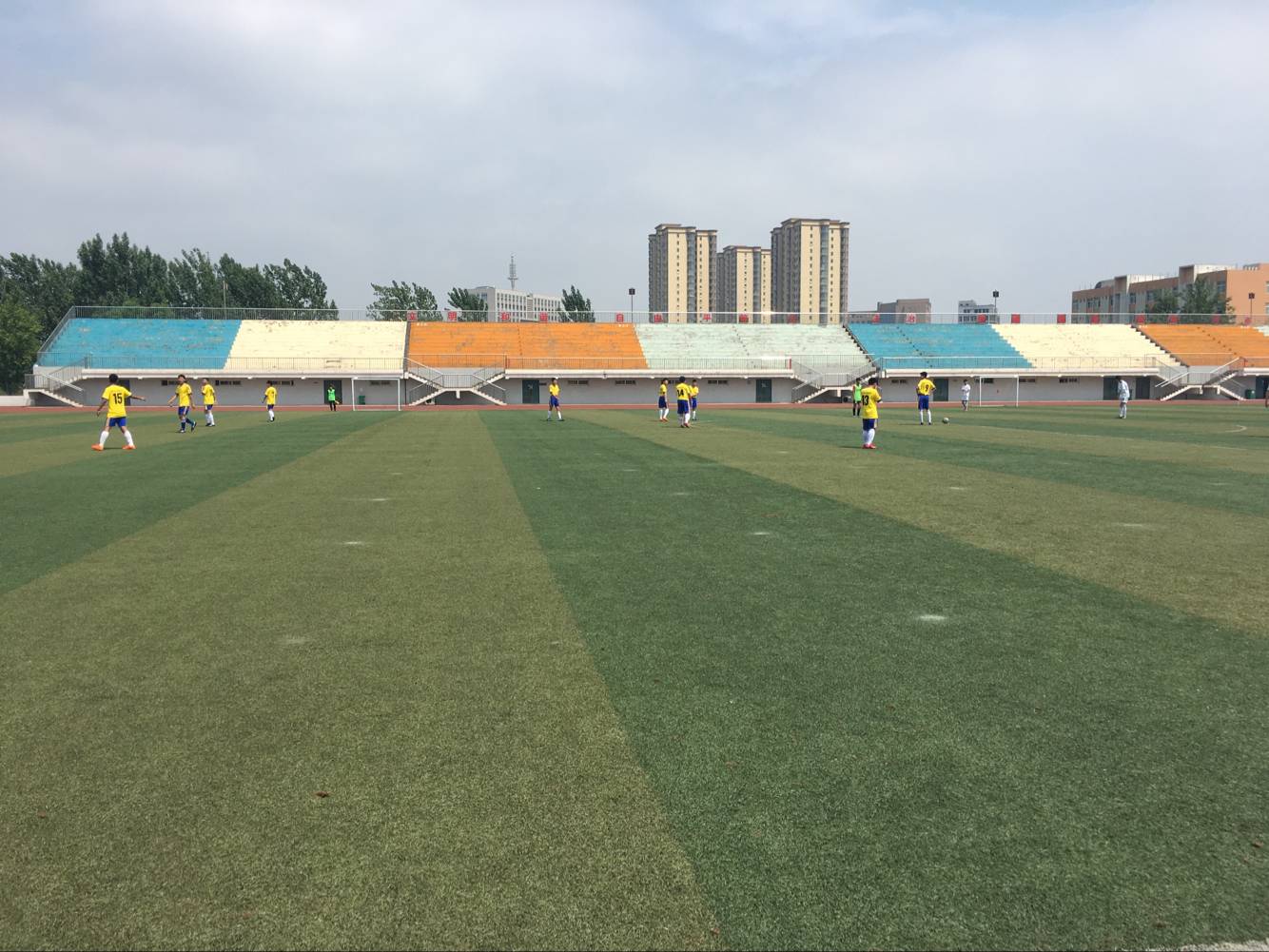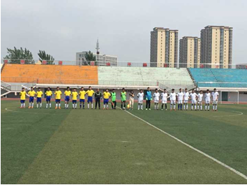 整场比赛都打得十分火热,双方攻势此起彼伏。比赛之前,双方都各自进行了积极热身,旁边的观众也都十分期待此次比赛。比赛在裁判的一声哨响中激烈得开始了。每一位球员都是球场上不甘落后的阳刚男儿,在场上争先恐后,来回传球。尽情展示团队的热情与默契。场上时时发起高潮,观众连连欢呼叫好。足球场就在比赛进行中一点点升温,感染着每一个人。守门员死死守住“战地”,与其他球员积极配合。球一次次逼近球门,一次次被守门员即使拦下,让旁边的观众看得惊心动魄。