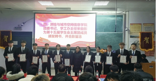 (团委书记宋自影为第十五届主席团成员颁发聘书并合影留念)