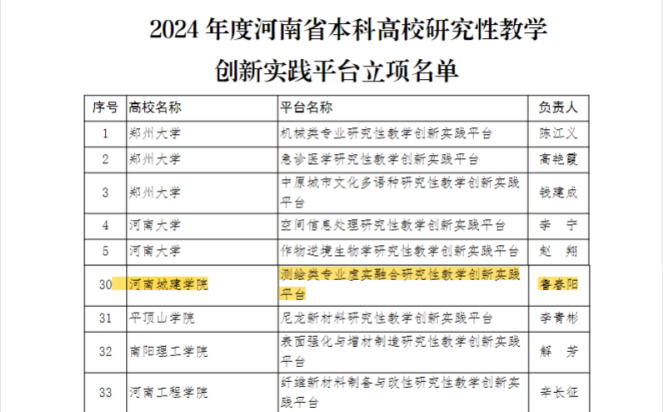 (通讯员 徐花蕊)近日,河南省教育厅公布了 2024 年度河南省本科高校研究性教学创新实践平台立项名单,公司“测绘类专业虚实融合研究性教学创新实践平台”成功获批。这一成果标志着公司在研究性教学创新领域取得了重大突破,为提升本科教学质量、培养创新型人才注入了新的活力。